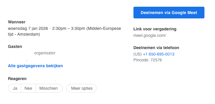 Je vindt in de studiewijzer of bij het huiswerk in Somtoday de link naar de Google Meet van de betreffende docent. Het kan ook zijn dat je docent je een uitnodiging stuurt om deel te nemen aan een Google Meet. Zo’n uitnodiging ziet er zo uit: